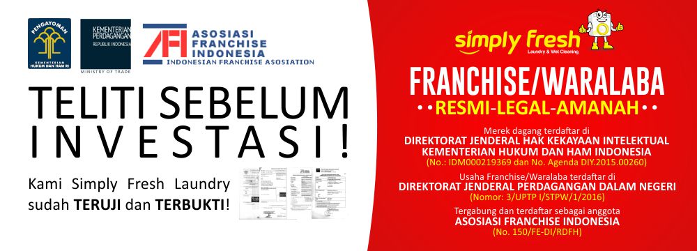 Teliti sebelum investasi pastikan anda bekerjasama dengan perusahaan yang telah memiliki izin Waralaba resmi. Simply Fresh Laundry telah memiliki Surat Tanda Pendaftaran Waralaba (STPW) dari Dirjen Perdagangan Dalam Negeri, serta tergabung dalam Asosiasi Franchise Indonesia (AFI)