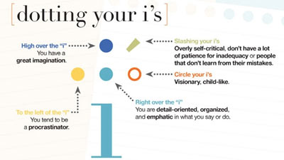 Terkadang saat seseorang menitikkan huruf i-nya, ia malah menggambar garis di atas huruf i bukan titik. Itu menandakan orang terkait adalah seseorang yang kritis, tidak sabar akan kekurangan, atau juga tidak belajar dari kesalahannya.