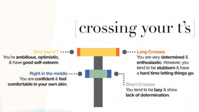 Apabila penulisan garis huruf t terlihat cukup panjang, maka itu menggambarkan seseorang yang memiliki tekad kuat dan entusias. Namun juga orang terkait adalah seseorang yang keras kepala dan susah melepaskan suatu hal.