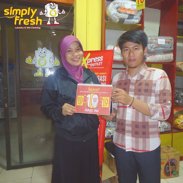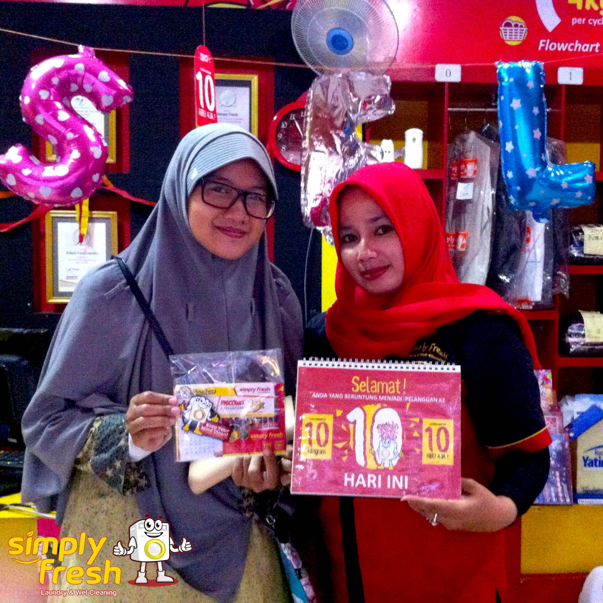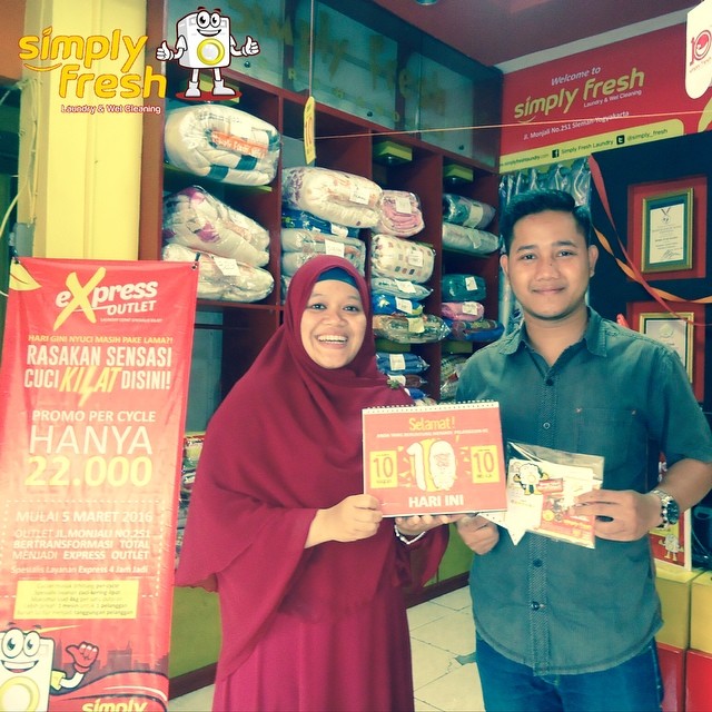 Awal Februari pelanggan outlet pusat Simply Fresh Laundry dikejutkan dengan promo heboh 10kilo=10ribu untuk pelanggan yang ke-10. Harga gila dengan hasil cuci yang tetap berkualitas tentu menjadi kejutan bagi pelanggan yang berhasil mendapatkan promonya. Salah satunya seperti yang disampaikan oleh Kak Hanum yang merupakan pelanggan setia Simply Fresh Laundry semenjak berkuliah di UGM Yogya “Saya memang langganan di sini, karena cuciannya bersih wangi dan pasti juga jadinya on time. Tambah seneng karena bisa dapet 10kilo 10ribu ini”